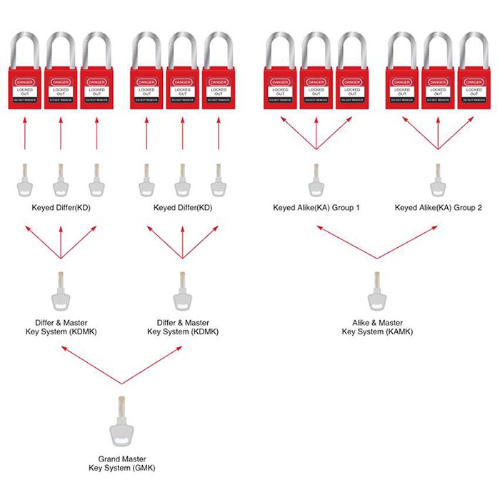 2) keyed alike (KA): Every padlock in the set can be opened with the same key. It will Reduce number of keys needed to carry. Ideal for individuals or trades responsible for multiple machines or isolation points.