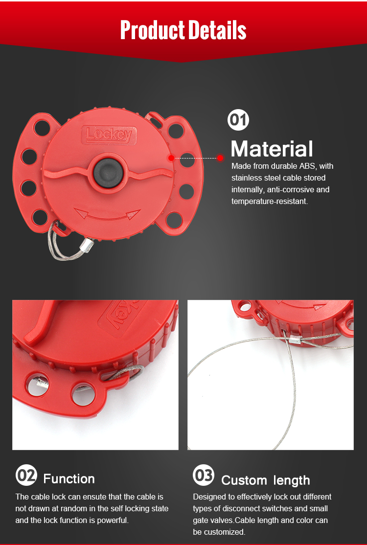 Lockey patent design mini cable lockout is perfect for use on disconnect switches and small gate valves. Mini Cable Lockouts are extremely compact and portable, cable stored internally. Push button self-winding mechanism retracts automatically to tightly cinch the cable, leaving no slack. Device comes complete with a non-conductive nylon cable attachment. Superior chemical, corrosion and temperature-resistant properties