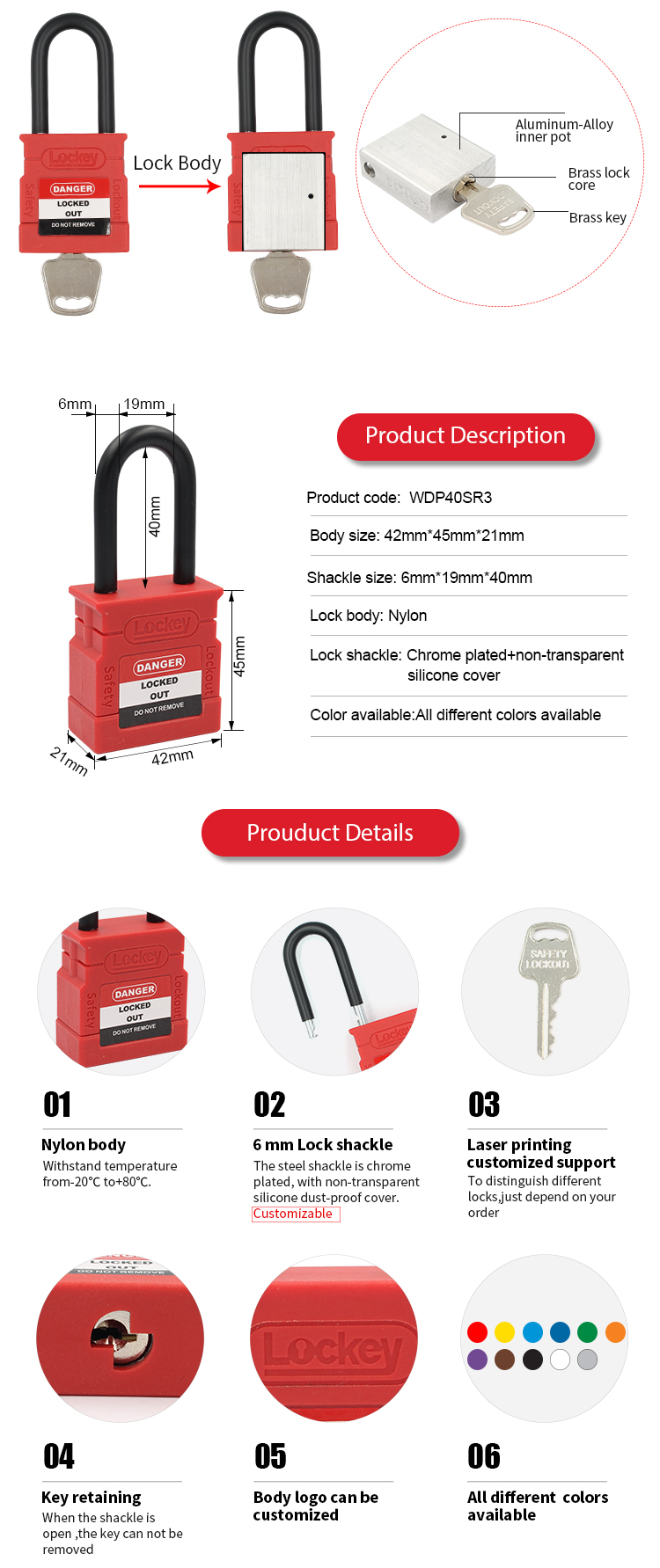 j) The nylon padlock is 12-pin high security, upto 400000 pcs different locking mechanisms available. It’s widely used in chemical, electrical, automobile industry, etc. Lock body material: nylon PA66 Shackle material: steel, nylon and stainless steel available. Shackle length: 25mm, 38mm and 76mm available. Other lengths can be customized.